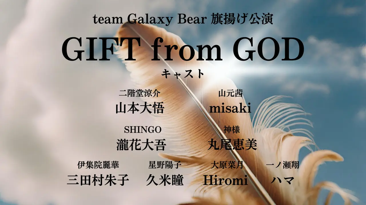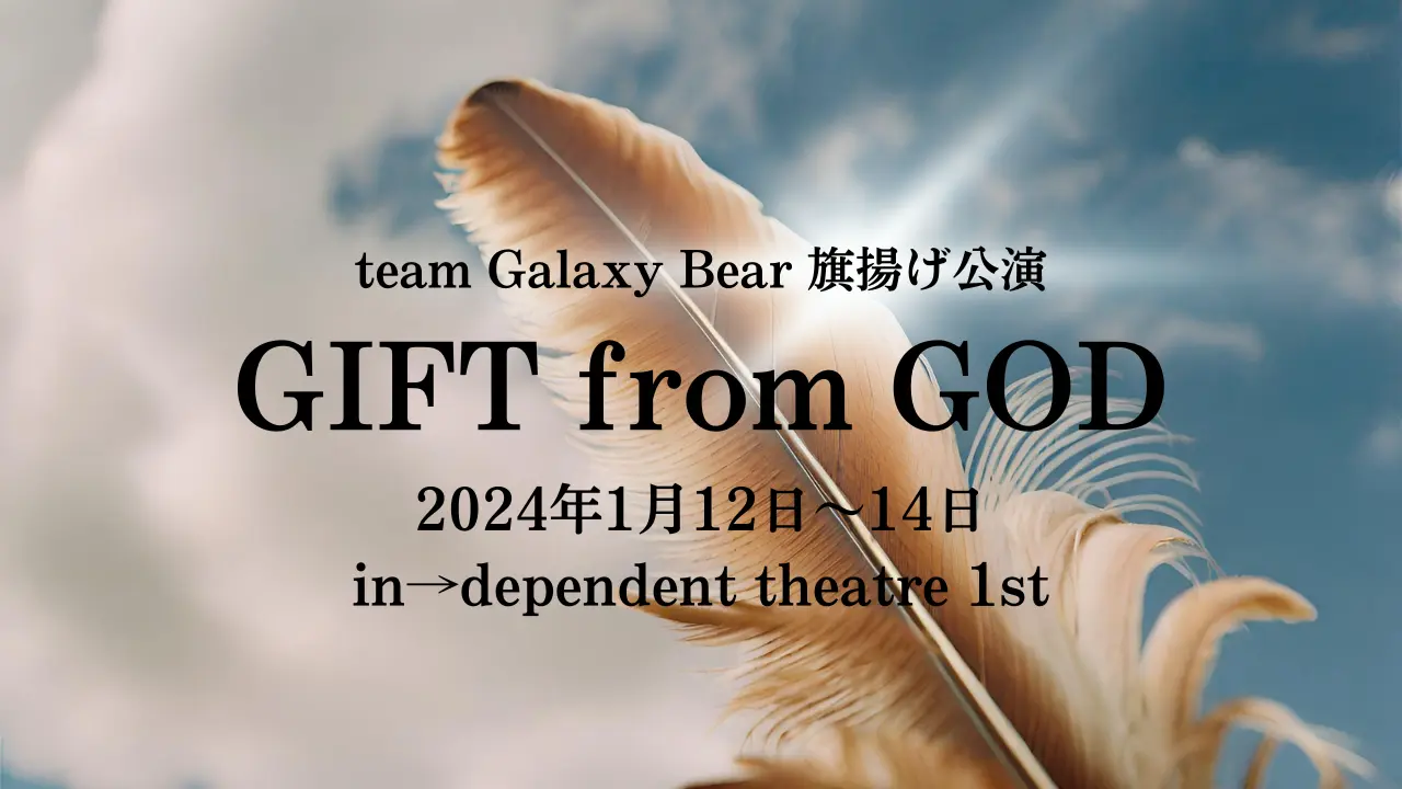 この度、team Galaxy Bearで劇団を立ち上げることとなりました! その旗揚げ公演である「GIFT from GOD」が1月12日〜14日に大阪のインディベンデントシアター1stという劇場で行われます! たくさんの方にこの作品を届けたいという思いで、今回のプロジェクトを立ち上げました!